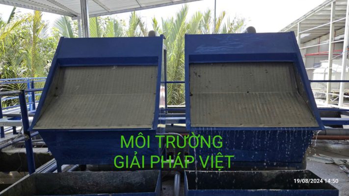 Dẫn nước thải vào thiết bị: Nước thải chảy vào bề mặt lưới nghiêng bằng Inox, với góc độ thiết kế tối ưu giúp phân bố dòng nước đều trên toàn bộ bề mặt.